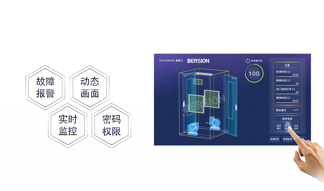 電子連鎖系統(tǒng)聯(lián)動(dòng)LED動(dòng)態(tài)字幕,顯示風(fēng)淋室運(yùn)行狀態(tài)